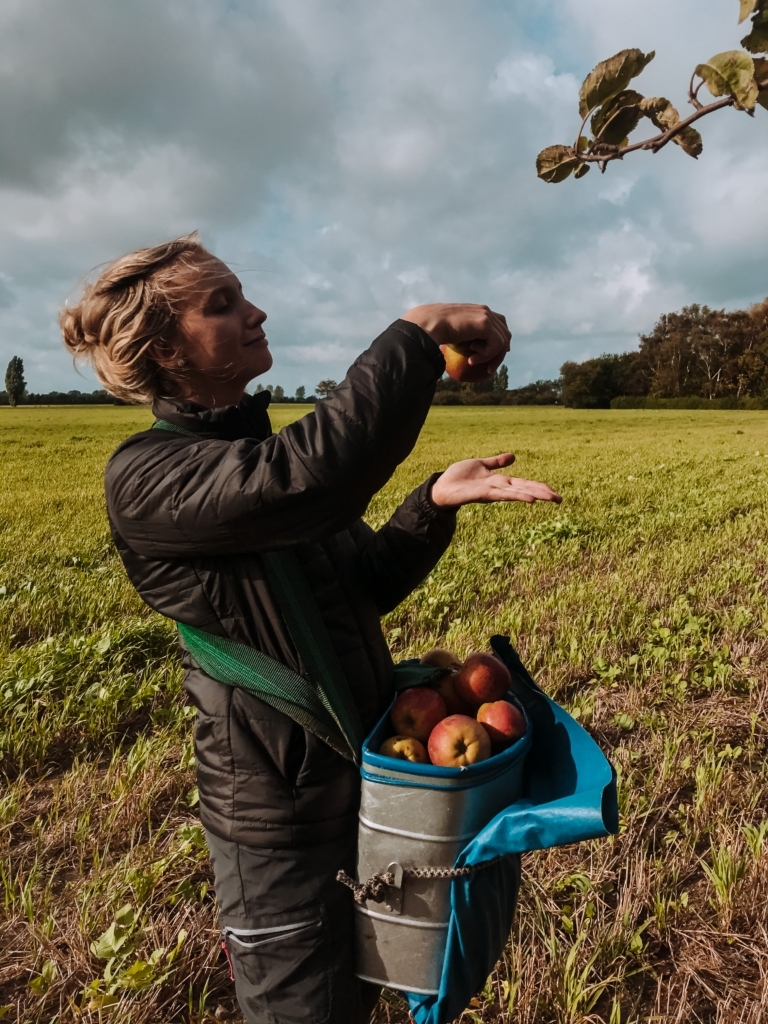 Většinu dní jsme se ale věnovali jablkům na cider, která musela spadnout sama. Často byla pidi midi, zarostlá v trávě, trní a byly jich tisíce. To jsme trávili celé dny v kleče a připadali si jako popelka, když třídila hrách.