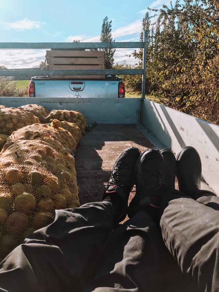 Nesbírali jsme jen jablka, občas jsme sbírali i ořechy a hrušky nebo si hráli na zahradníky. První dny jsme sbírali jablka z korun stromů. To vyžadovalo nasazení takové „tašky,“ do které jsme dávali opatrně jablka a nosili je do velkého boxu. Zní to jako idylka.. ale byla to sakra dřina. Ve dvou jsme tak během jednoho jediného dne nasbírali cca 800 kg jablek – což se zdá jako obrovské číslo, na mou duši, na psí uši!